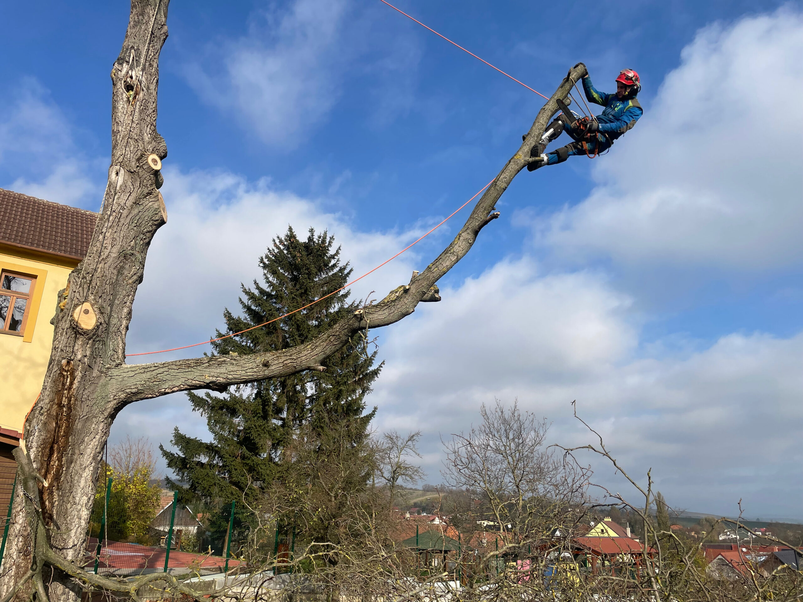 Bezpečné pílenie aj nebezpečných alebo ťažko prístupných stromov pri budovách, cestách či elektrickom vedení.